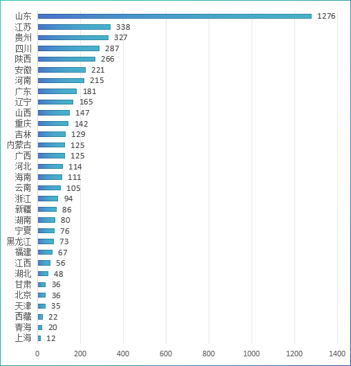 2025年新注册调味品流通企业数量前三位的省份分别是山东、江苏和贵州,分别为1276家、338家和327家。