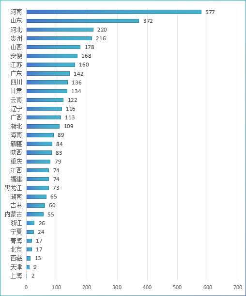 2025年新注册调味品制造企业数量前三位的省份分别是河南、山东和河北,分别为577家、372家和220家。