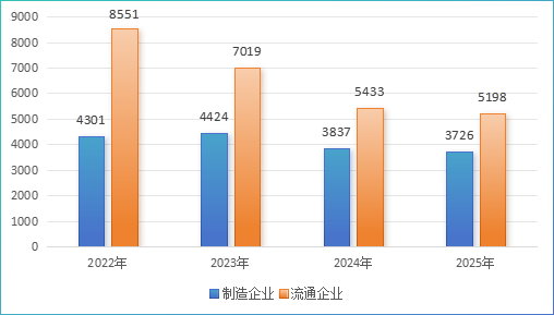 通过分析2025年新注册企业的行业分布可以发现,制造企业注册量同比下降2.9%,流通企业注册量同比下降4.3%。相比2024年,下降幅度明显收窄。